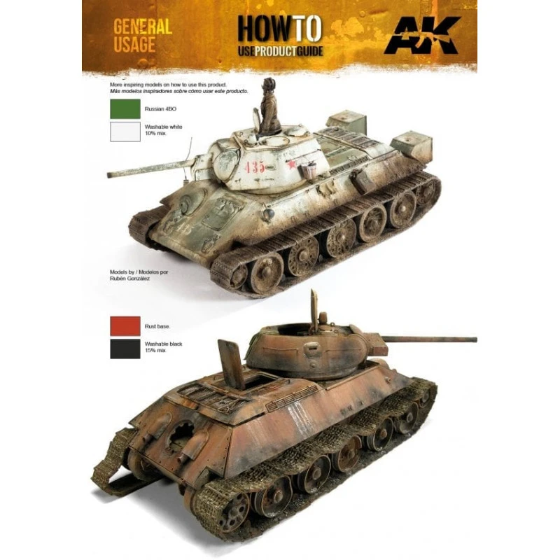 Agent Washable AK Interactive est un super produit qui convertit n’importe quelle peinture acrylique en lavable, il suffit de penser aux effets qui peuvent être obtenus sur tout type de modèles réduits. Développé par AK Interactive et aucune autre marque n’a ce produit. Ajoutez 10% de ce produit à votre peinture acrylique pour la rendre lavable. Une fois le mélange appliqué, vous pouvez retirer la quantité souhaitée avec un pinceau humecté d’eau. Ce produit est recommandé pour les camouflages hivernaux, pour créer d’éventuels effets de poussière, ou pour imiter les peintures de moindre qualité utilisées sur certains véhicules, par exemple dans le désert où la peinture en dessous s’est peu à peu abîmée. Le résultat est très probant car il est basé sur le même principe que la vraie peinture. Les possibilités sont infinies car l’effet peut être utilisé avec n’importe quelle couleur.