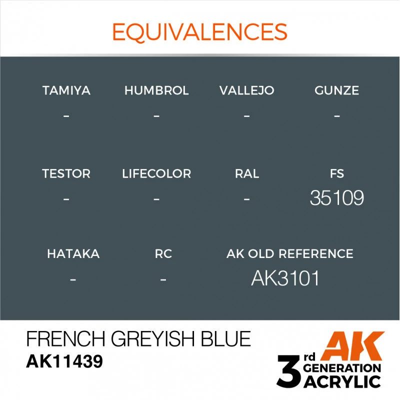 La teinte AK® French Greyish Blue fait partie intégrante de la gamme à étiquette de personnage d’AK Interactive®, une compilation minutieuse de couleurs spécifiques utilisées pour peindre des personnages historiques, des uniformes militaires aux uniformes modernes. Chaque couleur de cette gamme a été soigneusement sélectionnée pour garantir une reproduction fidèle et authentique des tenues et des équipements militaires de différentes époques.