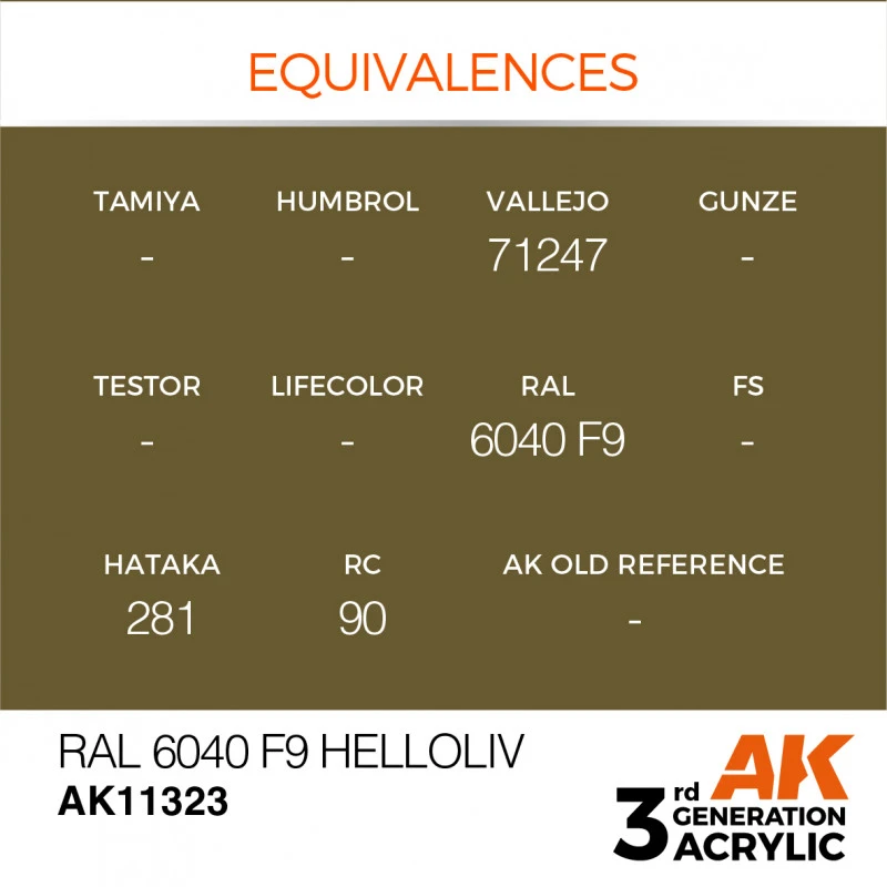La peinture acrylique AK Interactive® de 3ème génération, couleur Helloiv (Olive Clair) RAL6040 F9 référence AK11323, est une représentation fidèle d’une teinte spécifique utilisée dans différents contextes militaires et historiques.