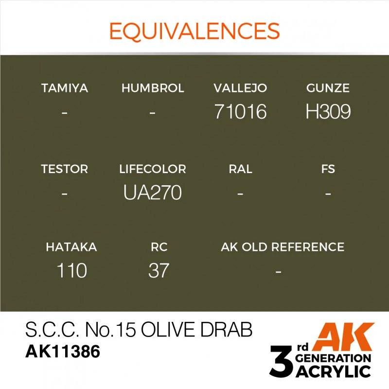 Explorez de nouvelles possibilités avec la peinture acrylique AK Interactive® de 3ème génération, dans la teinte S.C.C. n°15 olive drab, référence AK11386. Cette couleur emblématique offre des tonalités très particulières qui ont été utilisées par différentes armées à travers les époques, conformément aux normes FS, RAL et autres standards reconnus dans le domaine militaire.