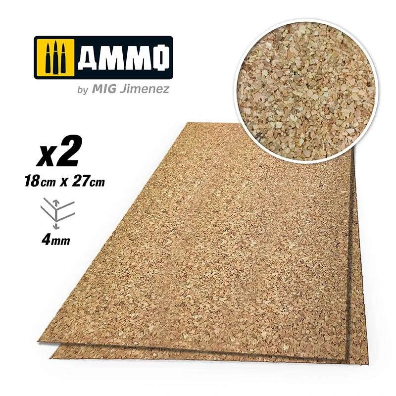 Lot de 2 feuilles de liège 4 mm avec grains moyen Ammo®. Indispensable pour simuler des pierres, des briques, des pavés, divers types de terrain et de nombreux autres éléments scéniques.