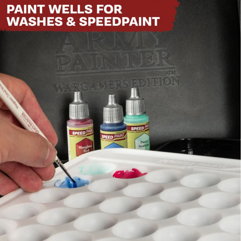 Une innovation pratique de cette édition est l’insert de puits de peinture en plastique dur, doté de 30 puits individuels. Ces puits sont idéaux pour organiser les Speedpaints et Washes, offrant une solution propre et ordonnée pour gérer les différentes consistances et propriétés des peintures. Cette fonctionnalité est particulièrement utile pour les artistes qui utilisent fréquemment des lavis ou des peintures à séchage rapide, permettant un accès facile et une organisation impeccable.