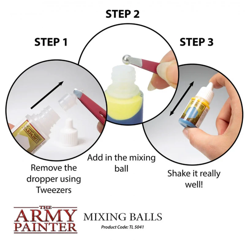 Le set de 100 billes en acier inoxydable Army Painter® (référence TL5041) est également un choix économique. Avec 100 billes dans un seul ensemble, vous disposez de suffisamment de billes pour équiper plusieurs dizaines de flacons de peinture, garantissant que tous vos produits restent dans des conditions optimales pour une utilisation immédiate. Ce kit est donc particulièrement adapté aux amateurs qui possèdent une large collection de peintures et qui souhaitent maintenir leur qualité sur le long terme.
