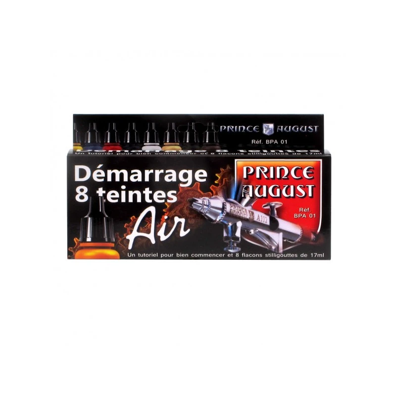 Ce coffret contient 8 teintes avec des couleurs primaires pour peindre avec n’importe quel aérographe : jaune, bleu, rouge, noir, blanc et une teinte chair, un vert olive et un marron terre de 17 ml. Ce coffret inclus également un tutoriel détaillé pour appréhender les mélanges de teintes et découvrir les techniques de base qui vous permettront d’obtenir rapidement les résultats souhaités en évitant bien des écueils.