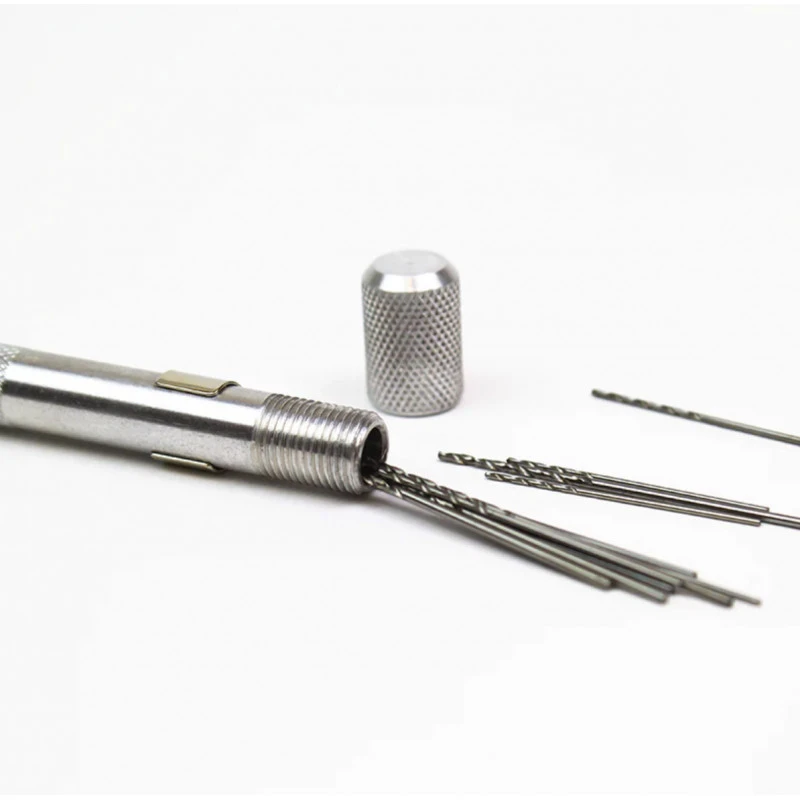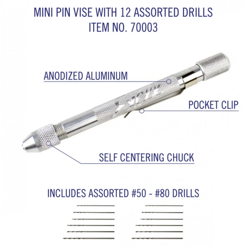 La mini perceuse manuelle à broches Excel® est équipée d’un mandrin en aluminium à centrage automatique permanent, capable d’accueillir une gamme de forets de précision allant du n°50 au n°80. Cela vous offre une grande flexibilité pour réaliser une variété de tâches de perçage avec une précision optimale.