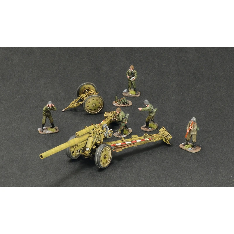 L’obusier SFH18 de 150 mm a été largement utilisé par la Wehrmacht pendant la Seconde Guerre mondiale sur tous les fronts majeurs. Il a été développé dans l’entre-deux-guerres par Rheinmetall et Krupp, les principaux fabricants d’artillerie en Allemagne, pour optimiser les ressources et les capacités technologiques dans les limites imposées par le traité de Versailles. À partir de 1933, les plans de réarmement de l’Allemagne sont devenus plus ambitieux et ont considérablement augmenté la production d’obusiers et de canons. Le SFH18 avait une structure simple mais fiable et une portée maximale de 13,5 Km. Il pouvait être tracté par des chevaux, décomposé en deux tronçons, ou plus couramment pendant la guerre par des véhicules semi-chenillés. Il employait sept serviteurs pour les opérations de positionnement et de tir. Une version avec un calibre de 105 mm (SK 10,5 cm) a été développée sur le même chariot, qui se caractérisait par le canon plus long, mais a été produite en quelques exemplaires car elle était beaucoup plus lourde que le standard 105 mm LeFH18, qui était l’artillerie de campagne canon fourni à la Wehrmacht.