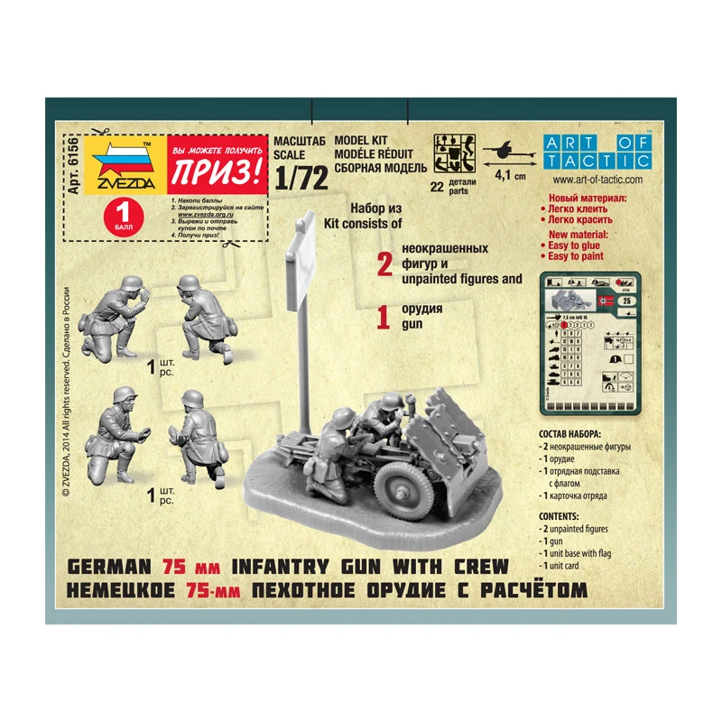 Maquette militaire Zvezda petit prix contenant un canon de 75 mm allemand avec 2 servants à assembler et à peindre. Échelle 1/72.