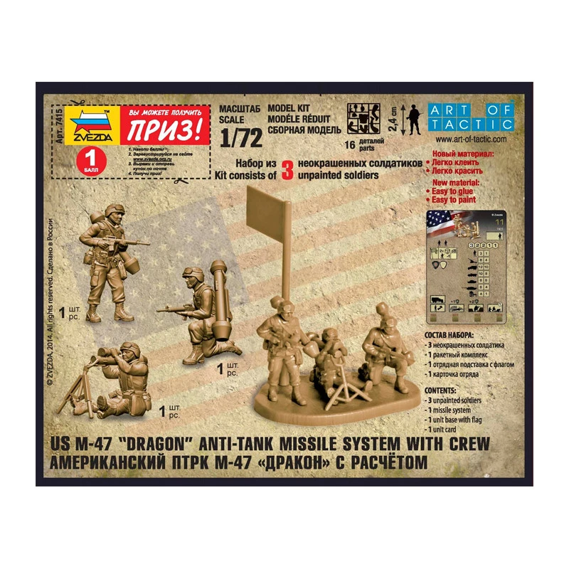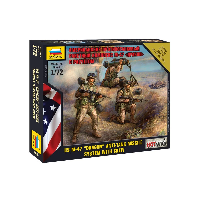 Maquette militaire Zvezda petit prix contenant 3 soldats américains (US Anti-tank missile system M-47 « Dragon » à peindre. Échelle 1:72.