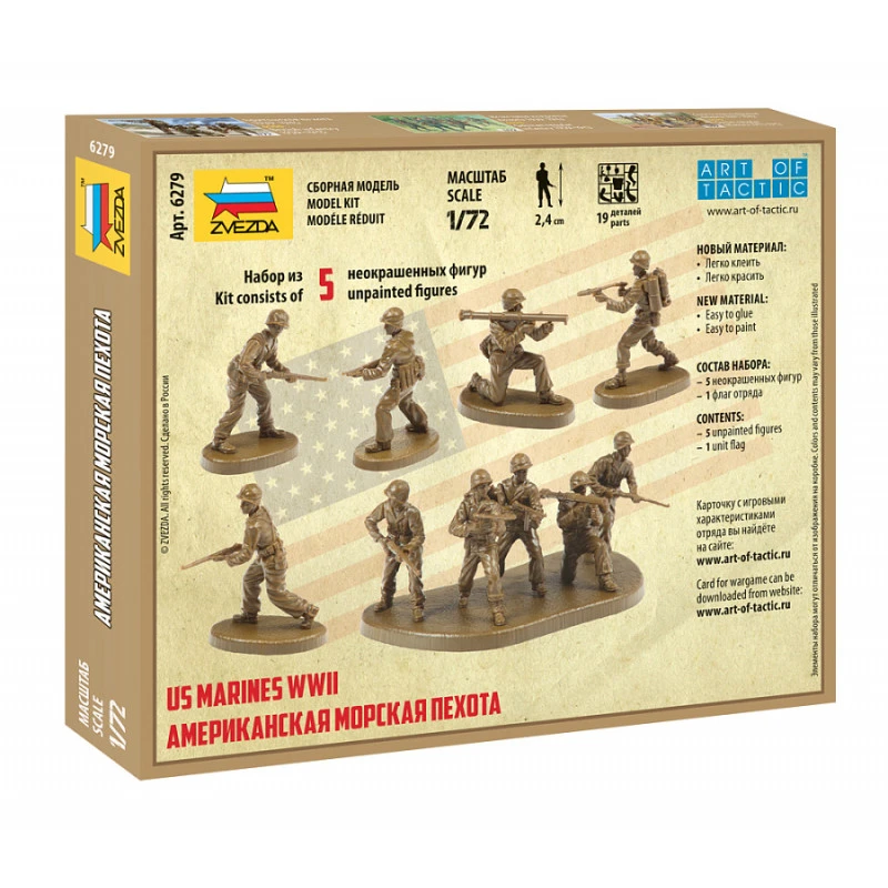 Maquette militaire Zvezda petit prix contenant 5 soldats US Marines de la seconde guerre mondiale à peindre. Échelle 1:72.