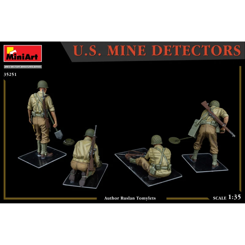 Ensemble de 5 figurines de soldats américains démineurs de la seconde guerre mondiale MiniArt® échelle 1:35. La boîte contient de nombreux accessoires tel qu’un détecteur à métaux, des mines allemandes, des fusils, casques, gourdes, …