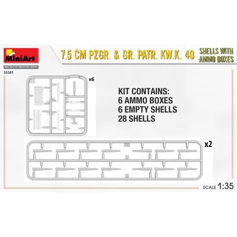 Maquette plastique comprenant plusieurs Obus avec caisses de munition 7.5 cm PZGR. & GR. PATR. KW.K. 40 1:35 à assembler échelle 1:35 MiniArt®.