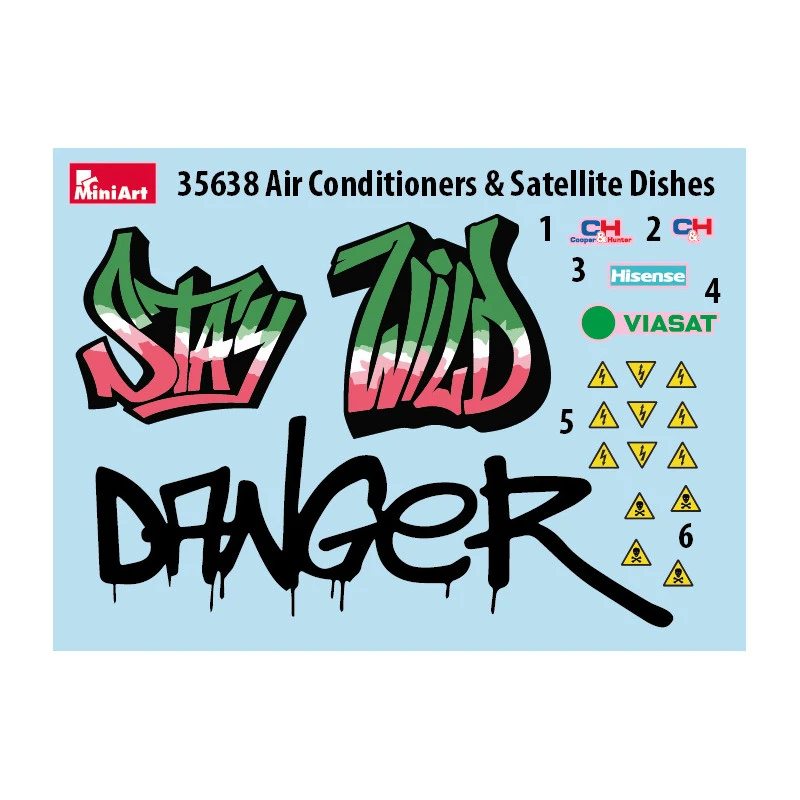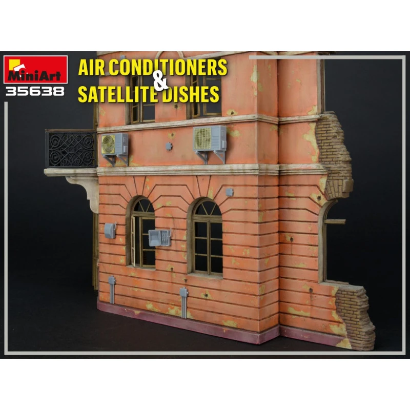 Maquette plastique, échelle 1:35eme, comprenant les pièces pour assembler des modèles de climatiseurs et d’antennes paraboliques ainsi qu’une planche de photodécoupe comprenant des tags de rue MiniArt® échelle 1:35. Modèle à assembler et à peindre.