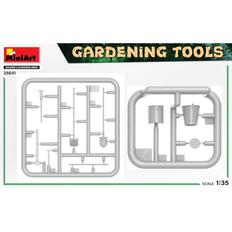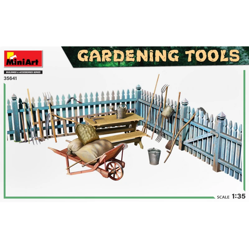 La marque MiniArt® propose sous la référence 35641, un set d’outils de jardin (pelle, brouette, sceau, arrosoir, …) de la seconde guerre mondiale à l’échelle 1:35ème.