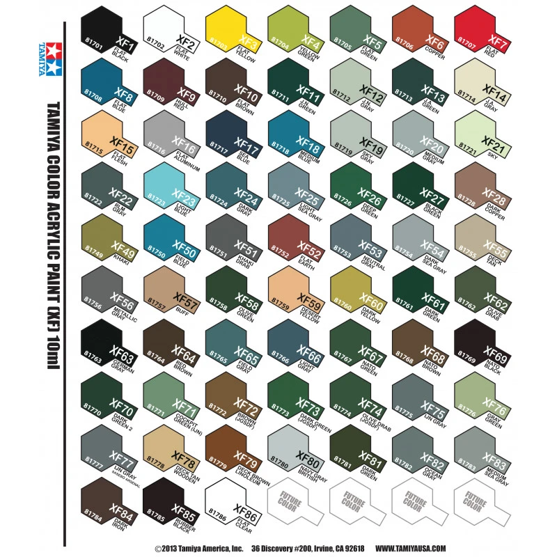 Pack peinture Tamiya acrylique XF (mat) complet comprenant toute la gamme Tamiya mat avec les références XF, inclus le diluant (thinner) X20A pour acrylique.