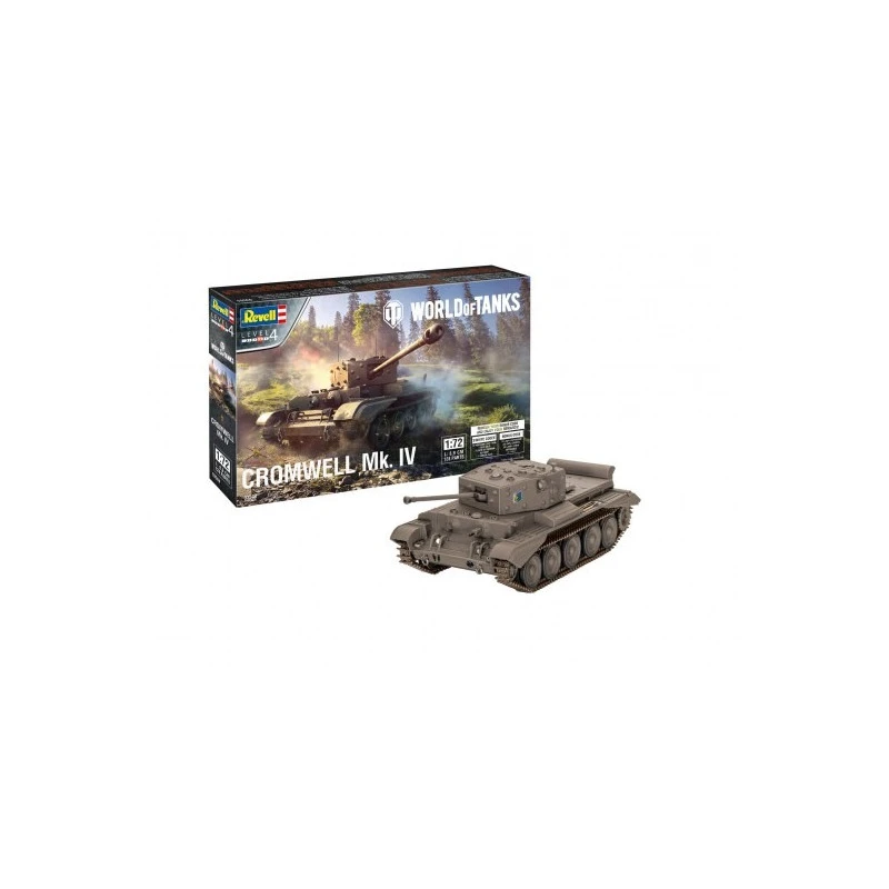 Maquette Revell® World of Tanks Cromwell MK IV échelle 1:72. Ce kit inclus des bonus pour le jeu World Of Tanks. Le kit inclus 128 pièces plastiques à assembler et à peindre, le kit inclus également des bonus (version PC) pour le jeu Worlf of Tanks.
