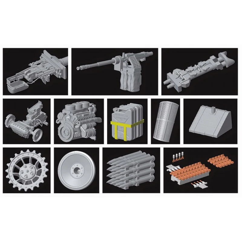 Le Pz.Kpfw VI (Sd.Kfz.181) Tiger est un char lourd allemand de la Seconde Guerre mondiale, l’un des véhicules de combat les plus célèbres de l’époque. Maquette Rye Field Model Tiger Ausf.E (early production) front est 1943 avec kit intérieur détaillé échelle 1:35.