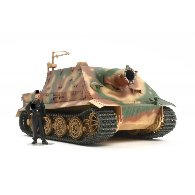 L’un des points forts de cette maquette réside dans l’inclusion d’une figurine, qui permet de contextualiser le véhicule et de renforcer son réalisme dans un diorama. Le niveau de détail des pièces individuelles est impressionnant : des textures subtiles du blindage aux gravures précises des composants mécaniques, chaque élément a été conçu pour refléter les spécificités de cette machine de guerre unique. Les chenilles en plastique injecté, faciles à assembler, offrent un excellent compromis entre réalisme et praticité, tandis que la tourelle fixe et le gigantesque lance-roquettes de 38 cm captent immédiatement l’attention. Les trappes du compartiment de combat, conçues pour être assemblées en position ouverte ou fermée, permettent aux modélistes de personnaliser leur création et d’exposer des détails internes, ajoutant une dimension supplémentaire à la maquette.
