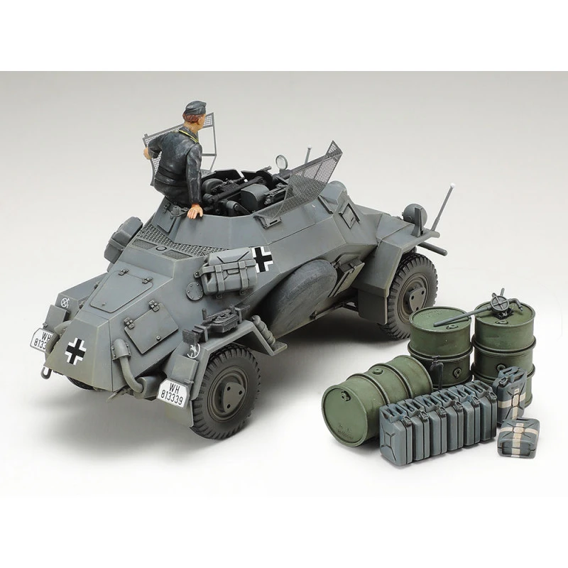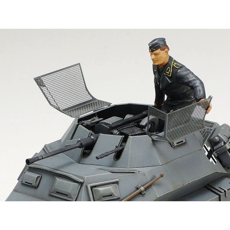 Tamiya® a également inclus une figurine dans ce kit, ce qui permet de donner vie au véhicule en ajoutant un élément humain. La figurine, bien détaillée, représente un soldat allemand en tenue de campagne, ce qui permet de créer une scène dynamique avec le Sd.Kfz.222 en action. Les détails sur l’uniforme, l’équipement et la posture de la figurine sont fidèlement reproduits, offrant une dimension supplémentaire de réalisme.