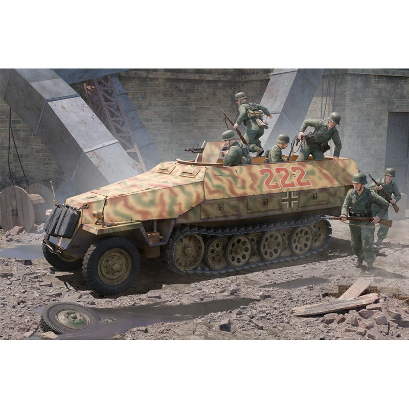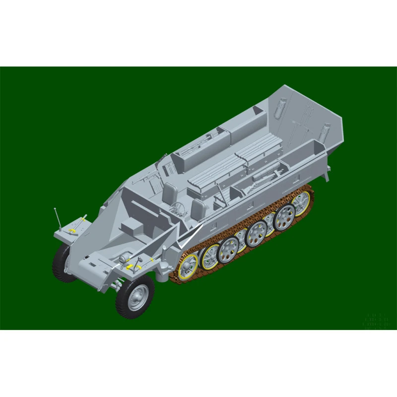 Au cours de sa production, quatre versions de base du Sd.Kfz 251 ont été développées : les Ausf. A, B, C et D. Ces versions différaient principalement par des détails liés au processus de production et par la disposition interne des éléments. La version D, reproduite par cette maquette Trumpeter®, est l’une des plus largement utilisées, connue pour sa simplification de la production et sa robustesse accrue.